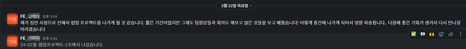 시작한지 얼마안되, FE인원 중 한 분이 개인사정때문에 그만두게 되어서 최종적으로 FE 2명 BE 3명에서 프로젝트를 진행하게 되었습니다.