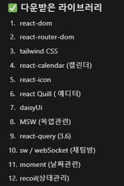 Recoil, Tailwind CSS, daisyUI 와같은 라이브러리뿐만 아니라react-calendar(캘린더), react Quill(에디터) 등 이미 만들어진 많은 라이브러리들을 평소에 사용할 일이 없었기 때문에 사용할 일이 없었는데, 이러한 라이브러리들을 최대한 활용해 봄으로써 어떤식으로 사용을 할 수 있나 과정을 직접 경험해 봄으로써 알게되었고, 다른 라이브러리들도 대부분 비슷하다는 것을 알게되었습니다.