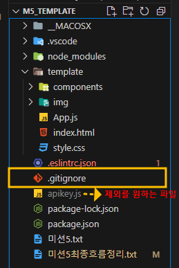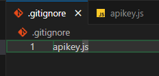 아래 사진과같이 .gitignore 파일에 apikey.js 를 입력해주면 무시되어 올라간다.