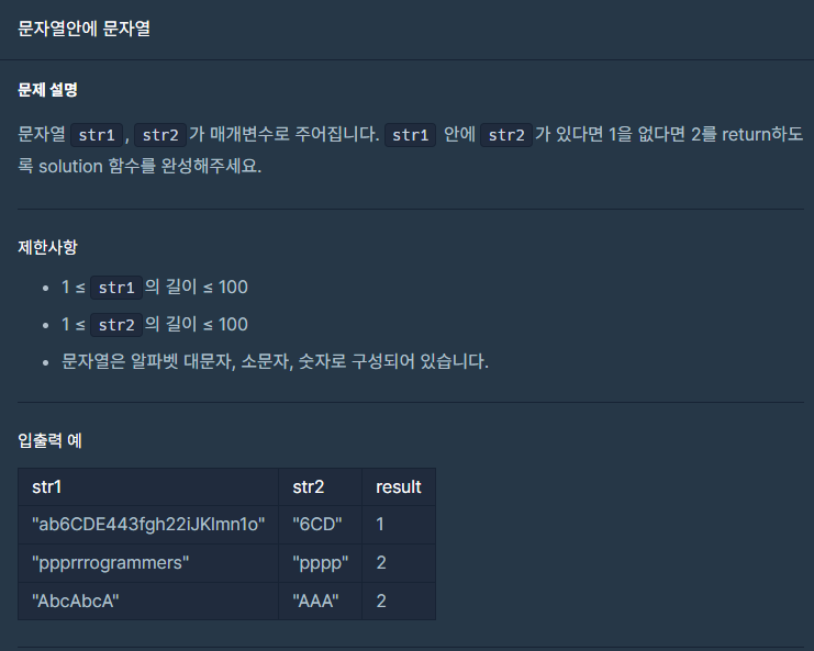 나의풀이 -> includes()사용 function solution(str1, str2) { if(str1.includes(str2)) return 1; else return 2 } 다른사람풀이-> split() 사용 function solution(str1, str2) { return str1.split(str2).length > 1 ? 1 : 2 } split 사용법 → str1 , str2는 각각 문자열이다. 1. str1.split(str2) 을하면 str2를 구분자로 str1을 나눠준다. ( str1에 str2가 없다면 결과값은 배열길이가 1인 배열로 나온다. 입력값 "ab6CDE443fgh22iJKlmn1o", "6CD” "ppprrrogrammers", "pppp” "AbcAbcA", "A..